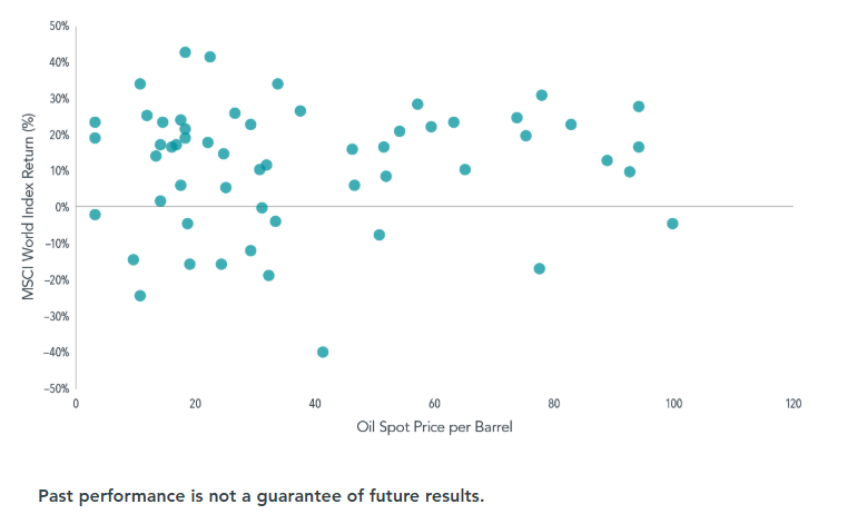 Market volatility rose and oil prices spiked after the US and Israel struck Iran in late February, with hostilities continuing in Iran and elsewhere in the Mideast into March. The impact on crude supplies helped push oil prices notably higher.5 Amid growing concerns about energy, it is worth remembering that global equity returns have not been correlated with the level of oil prices (see Exhibit 1). While the cost of oil may have some impact on markets, it is just one of many factors that investors consider when looking at market performance.